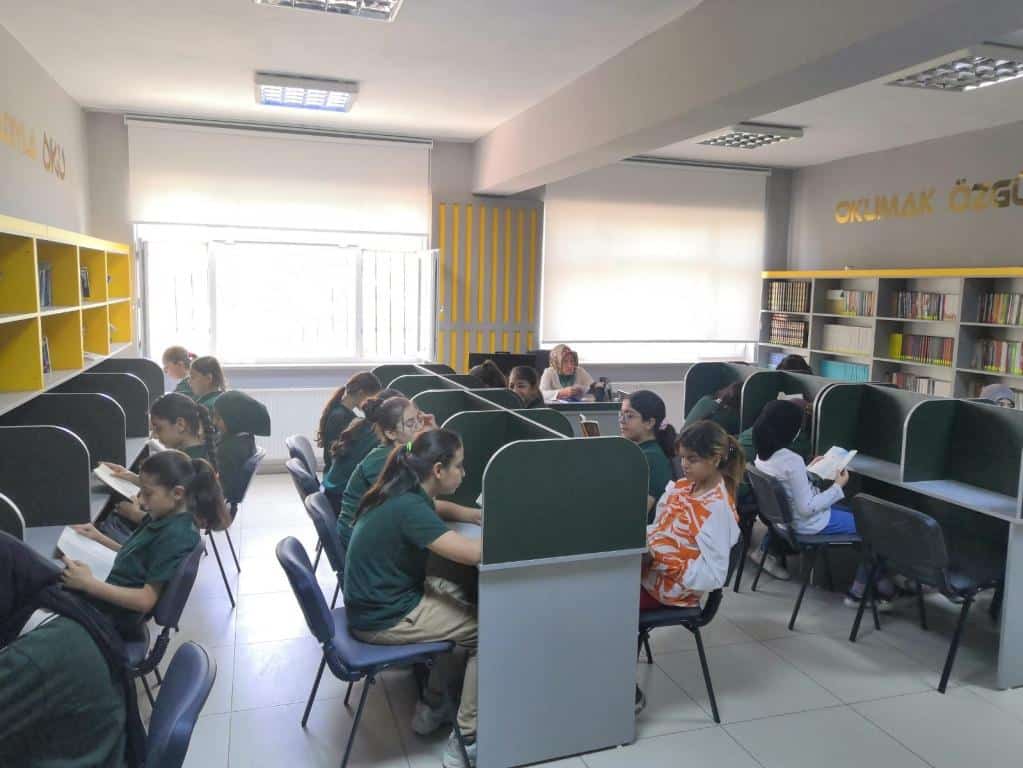 Okul kütüphanesi öğrencilerimiz tarafından aktif bir şekilde kullanılıyor. Kütüphane kullanım kuralları öğretmenlerimiz tarafından öğrencilerimize anlatılarak bu kurallara uyulması gerektiği uygulamalı olarak gösteriliyor.
